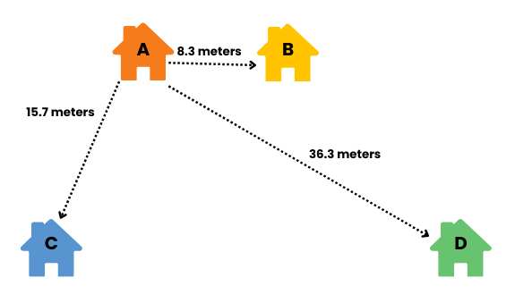 Example of structure separation distances used to build the California Structure Graph. Each pair of buildings within 100 meters becomes an edge in the graph, with the exact boundary-to-boundary distance recorded. These measurements (e.g., 8.3 m, 15.7 m, 36.3 m) form the basis for the connectivity metrics calculated statewide.