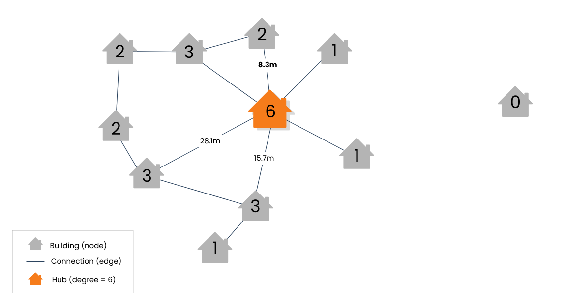 - Degree counts how many nearby buildings are connected to a given structure within a chosen distance range.